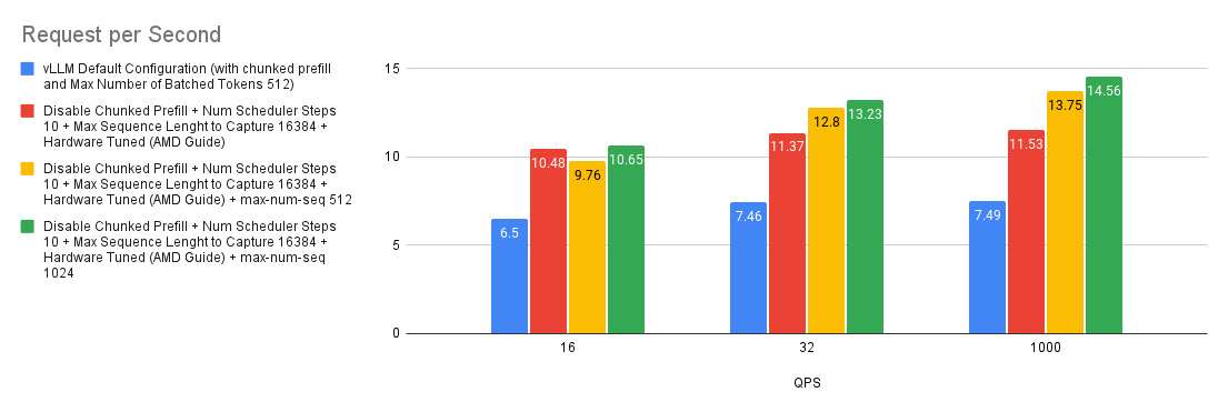 Based on the experiment we ran, we found that there’s a slight improvement with tuning the chunked prefill values over disabling the chunked prefill feature. However, if you’re not sure whether to enable chunked prefill or not, simply start off by disabling it and you should generally expect better performance than with using the default settings. This is specific to MI300X GPUs.
